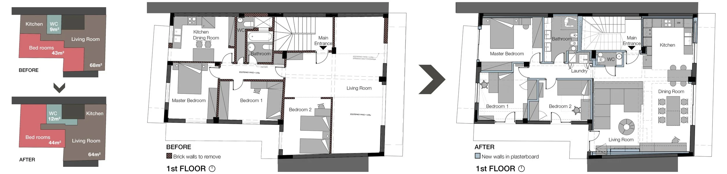 Εσωτερικά, στον όροφο της κατοικίας, απομακρύνθηκαν όλες οι εσωτερικές τοιχοποιίες και τα δάπεδα. Μετά την στατική ενίσχυση του φέροντα οργανισμού, με ανθρακονήματα, ελάσματα και υαλοπλέγματα, σε κολόνες, δοκάρια και τοιχοποιίες αντίστοιχα, σειρά είχε η σωστή διαρρύθμιση των λειτουργιών τις κατοικίας. Έτσι η κουζίνα από την Δυτική πλευρά, ήρθε στην Ανατολική, όπου βρισκόταν και το σαλόνι, ενώ προστέθηκε ένα ακόμα wc για τους επισκέπτες. Όλες οι νέες τοιχοποιίες κατασκευάστηκαν από ξηρά δόμηση με αυξημένη την ηχομονωτική τους ιδιότητα και οι μονάδες ψύξης κρύφτηκαν στα ταβάνια.