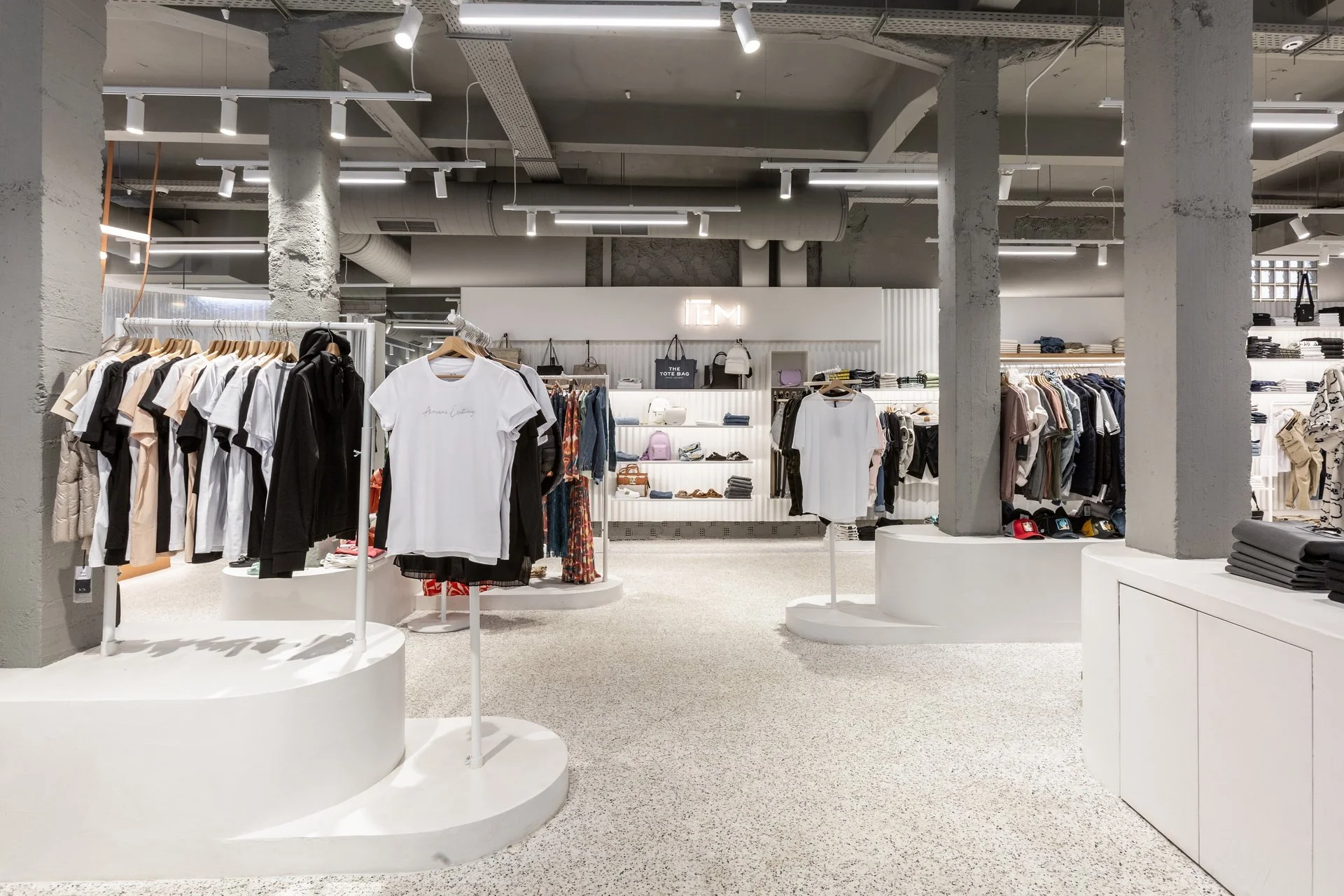 The old wall coverings were removed, allowing the building to breathe and reveal its original form. A white stripe embraced the rough masonry, creating a new neutral backdrop for the products. The rest of the building was preserved in its original state, with its retro aesthetic emphasized through a dark gray hue that highlights the contrast between the old and the new. The furniture was designed to offer alternative ways of displaying garments, and its curved forms harmonize with the movements of the users.