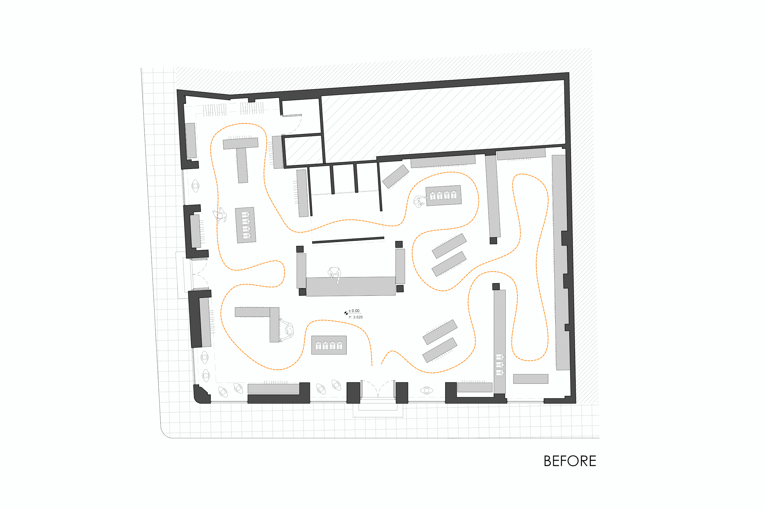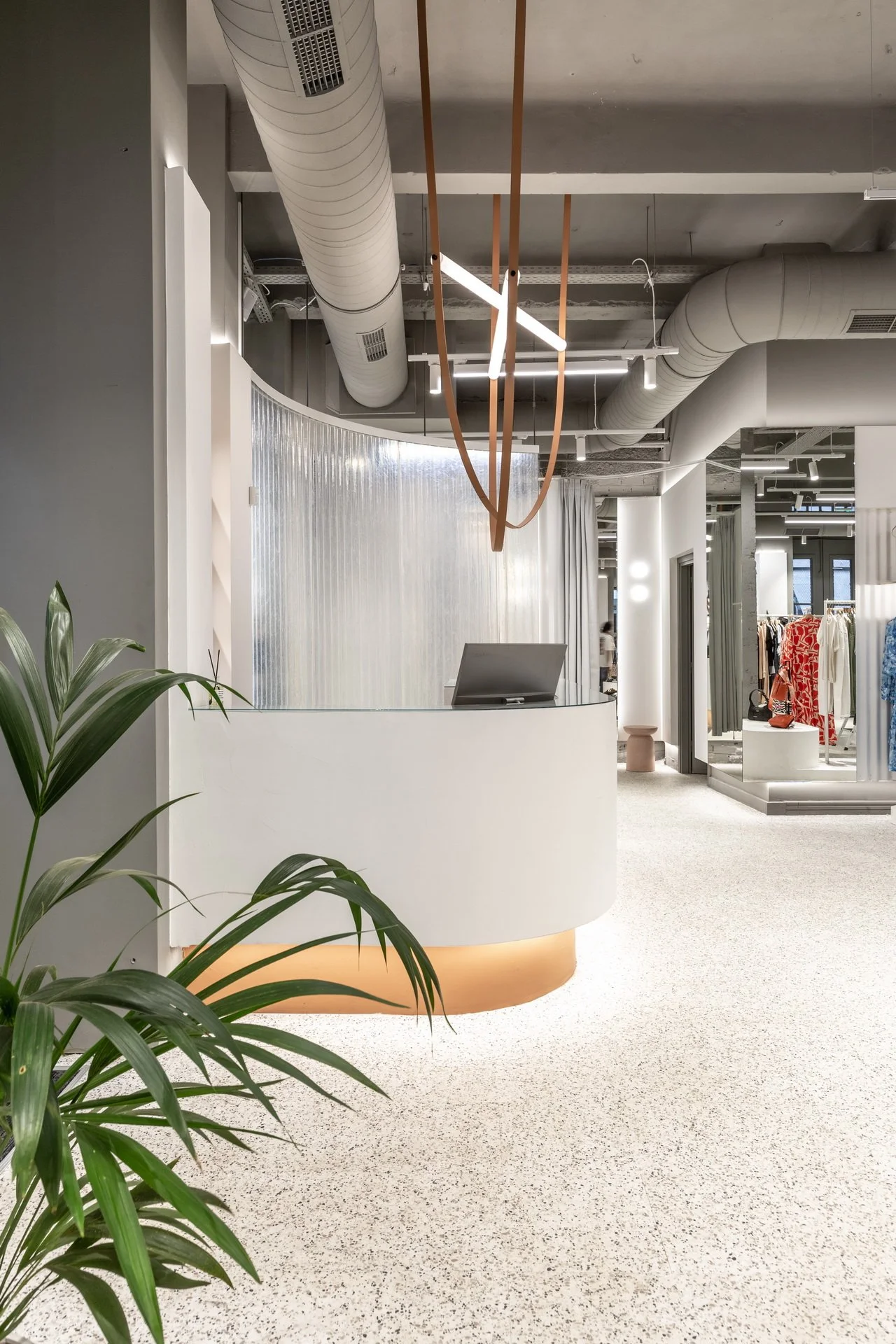 Οι παλιές επενδύσεις στους τοίχους αφαιρέθηκαν, δίνοντας τη δυνατότητα στο κτήριο να αναπνεύσει και να αποκαλύψει την αρχική μορφή του. Μια λευκή λωρίδα αγκάλιασε την τραχιά τοιχοποιία και δημιούργησε το νέο ουδέτερο υπόβαθρο για να τοποθετηθούν τα προϊόντα. Το υπόλοιπο κτίριο διατηρήθηκε στην αρχική του μορφή, με τη ρετρό αισθητική του να τονίζεται μέσα από μια σκοτεινή, γκρι απόχρωση που υπογραμμίζει την αντίθεση του παλιού με το νέο. Τα έπιπλα σχεδιάστηκαν με σκοπό να δημιουργούν εναλλακτικούς τρόπους παρουσίασης των ενδυμάτων και μέσω της καμπυλωτής μορφής τους να εναρμονίζονται με τις κινήσεις των χρηστών.